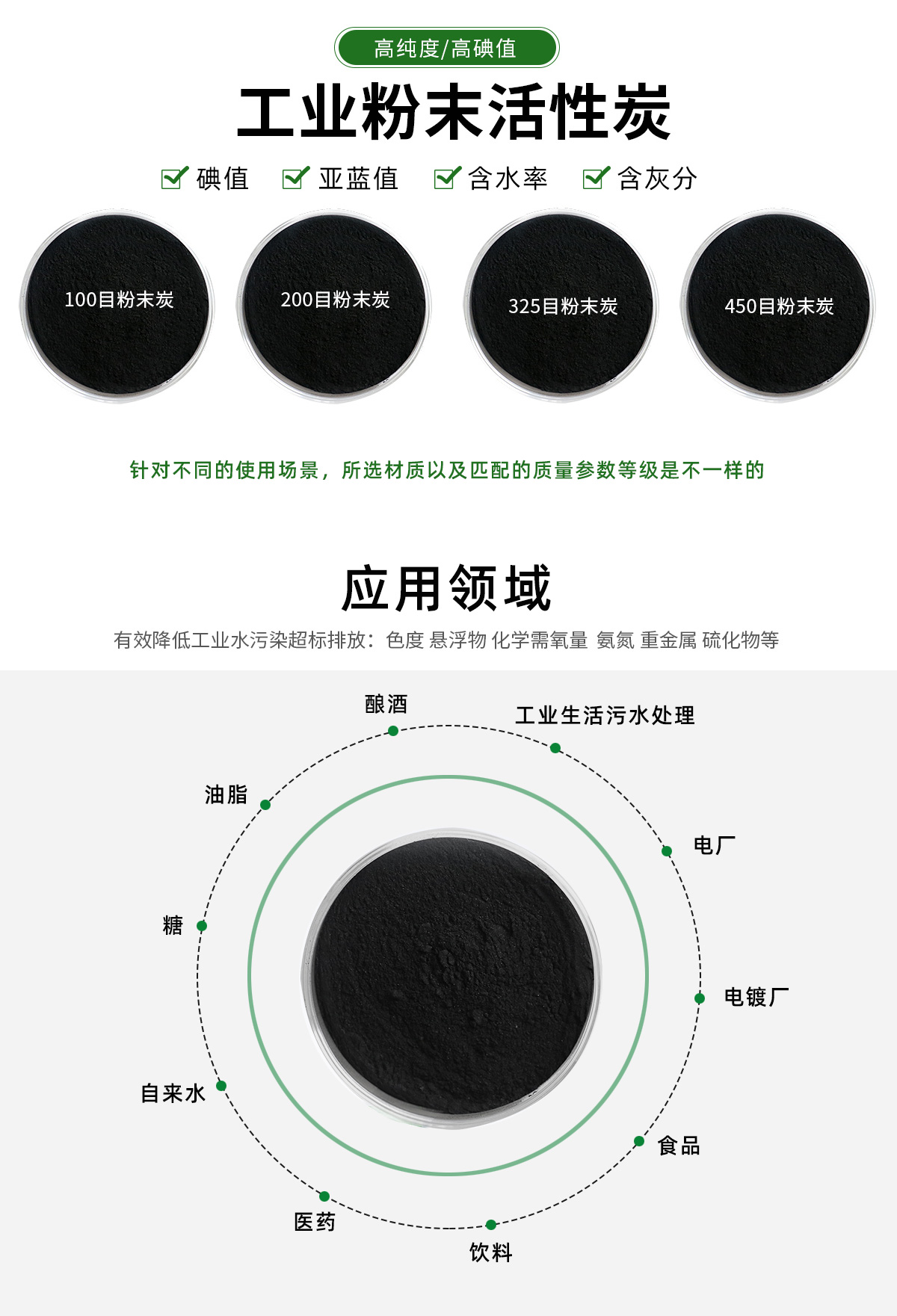粉末活性炭按材质分类主要有:煤质粉炭、木质粉炭、椰壳粉炭, 由三种不同原料经一系列工艺制成的面粉状的炭粉,最常用的粒径大小为200目。产品功效质量要看关键指标参数:碘值、亚蓝值、含水率 含灰分这几项。针对不同的使用场景,所选材质以及匹配的质量参数等级是不一样的。